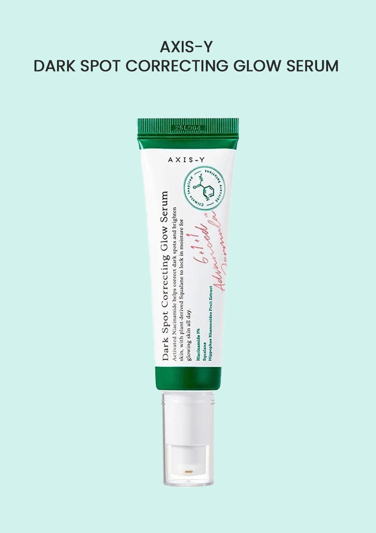 - Axis-Y Dark Spot Correcting Glow Serum is a 5% Niacinamide-based serum that corrects dark spots and improves uneven skin tone. With the help of plant-derived Squalane, this serum retains moisture to keep your skin glowing and healthy wherever you go.
