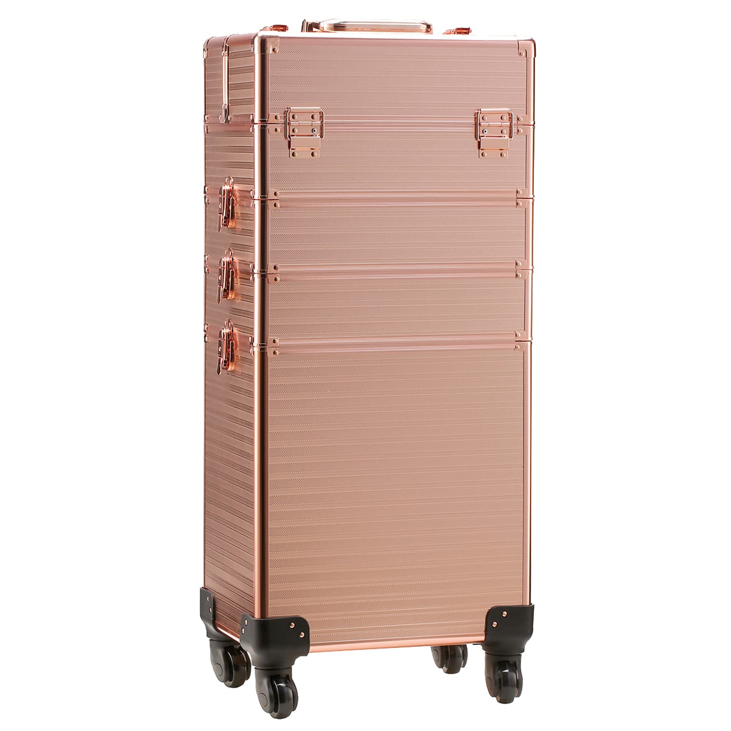 Channcase 4 in 1 Portable Traveling Aluminum Professional Makeup Trolley Cart with Multiple-Sized Compartments and Wheels, Rose Gold