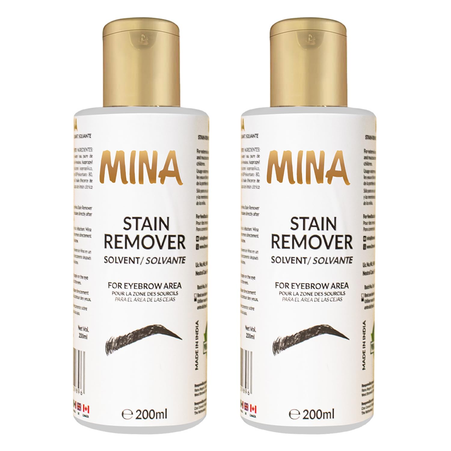 - Non-irritating effortless removal: - Mina Stain Remover formulated from Himalayan Spring Water and Lemon Peel Oil. Softly removes tint color from the skin around the eyebrows.