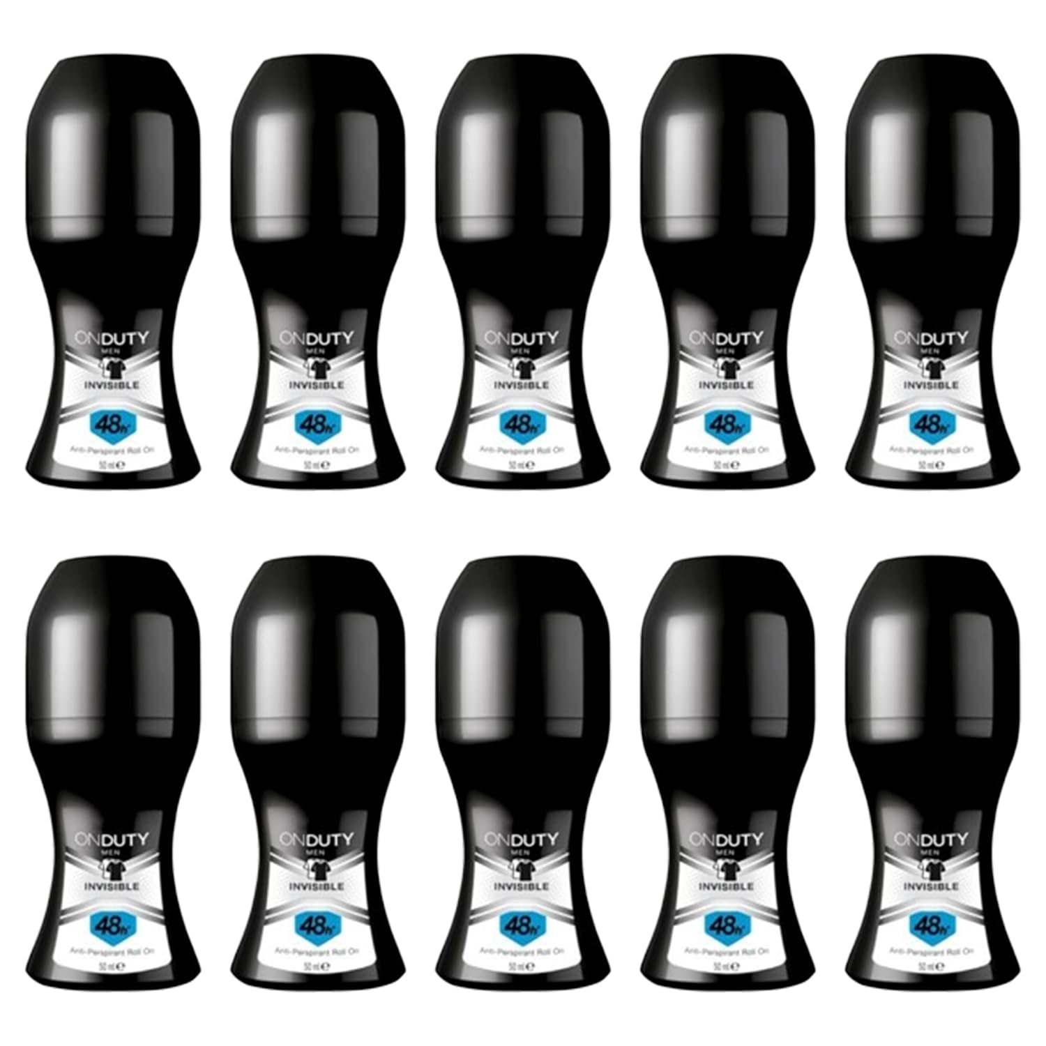 On Duty Invisible Men's Antiperspirant Roll On Deodorant 50 ml, Formula that does not cause yellow stains on clothes, Protective barrier against sweat with Dry pore technology (Pack Of 10)