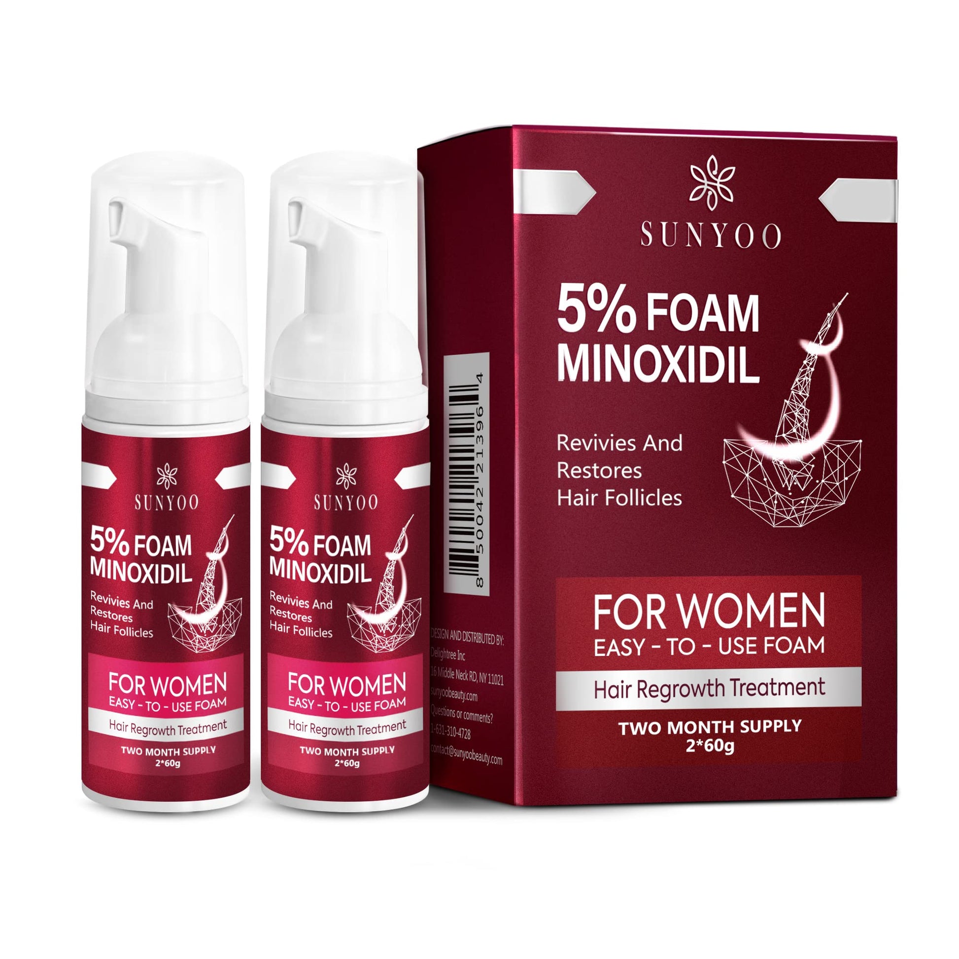 SUNYOO 5% Minoxidil Foam for Hair Thinning and Hair Loss, Hair Growth Treatment for Women's Thicker and Fuller Hair, 2 Pack of 60g